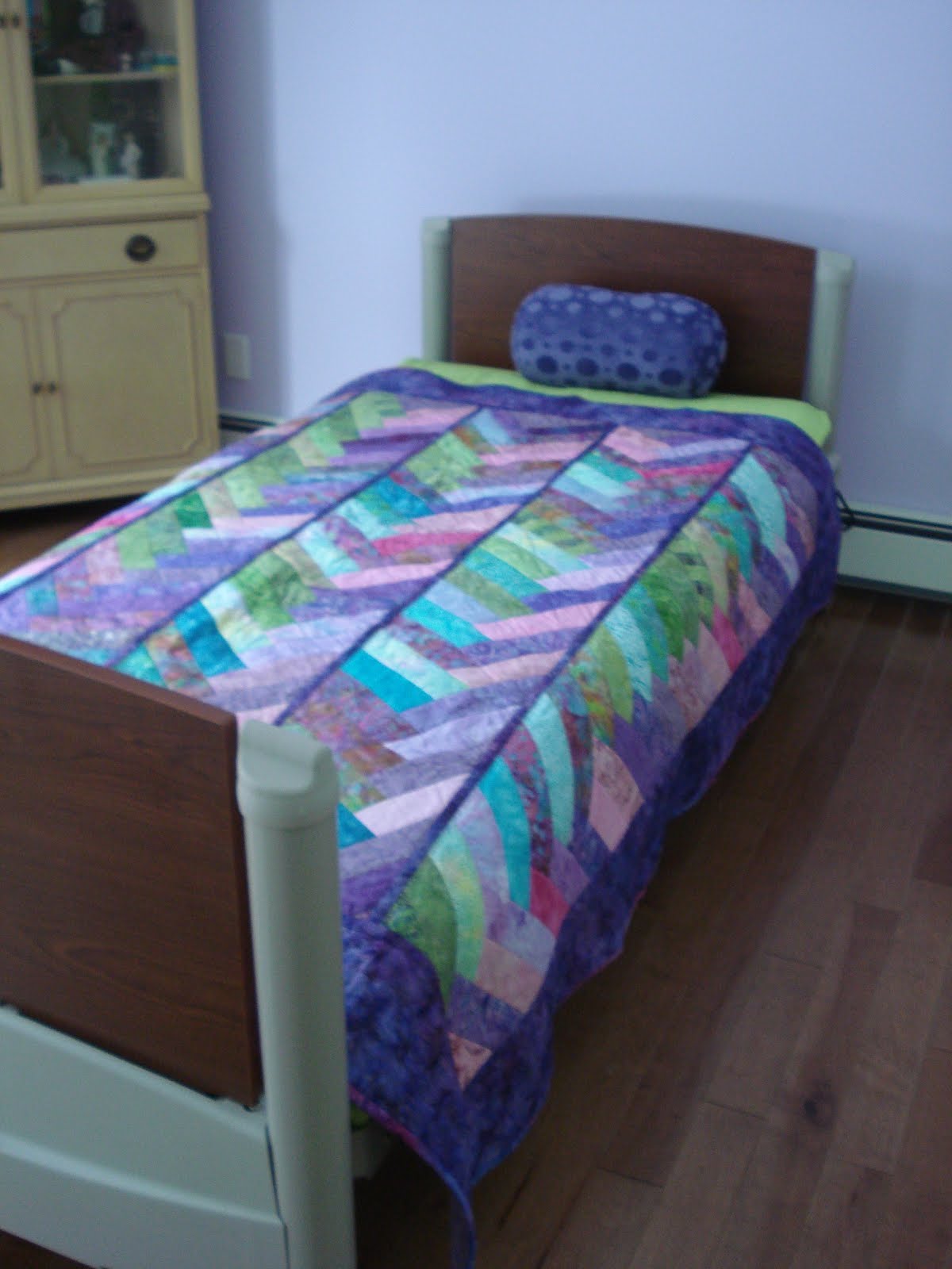 Well it isn't a cross stitch finish but it's a finished house that needs some finished cross stitch on the walls . My daughter is officially in her new room and has been for a week. She loves her new bed. It goes up and down and is very handy . This is the beautiful quilt my Mom made for her for Christmas. The colours are perfect in the purple and lime green room . My son received a beautiful quilt also . Will have to take more pictures of it .Can't wait till the warmer weather comes to sit out on the deck . The addition won't be painted till the spring but other than that all is completed. The empty room picture shows you the big windows and spacious room.